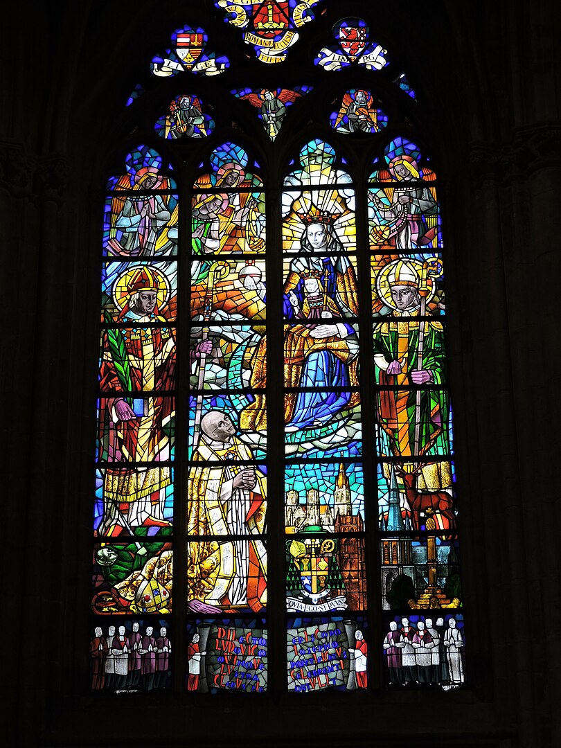 Die Jungfrau der Armen: Buntglas-Kirchenfenster in der Kathedrale St. Paul in Liège (Lüttich)