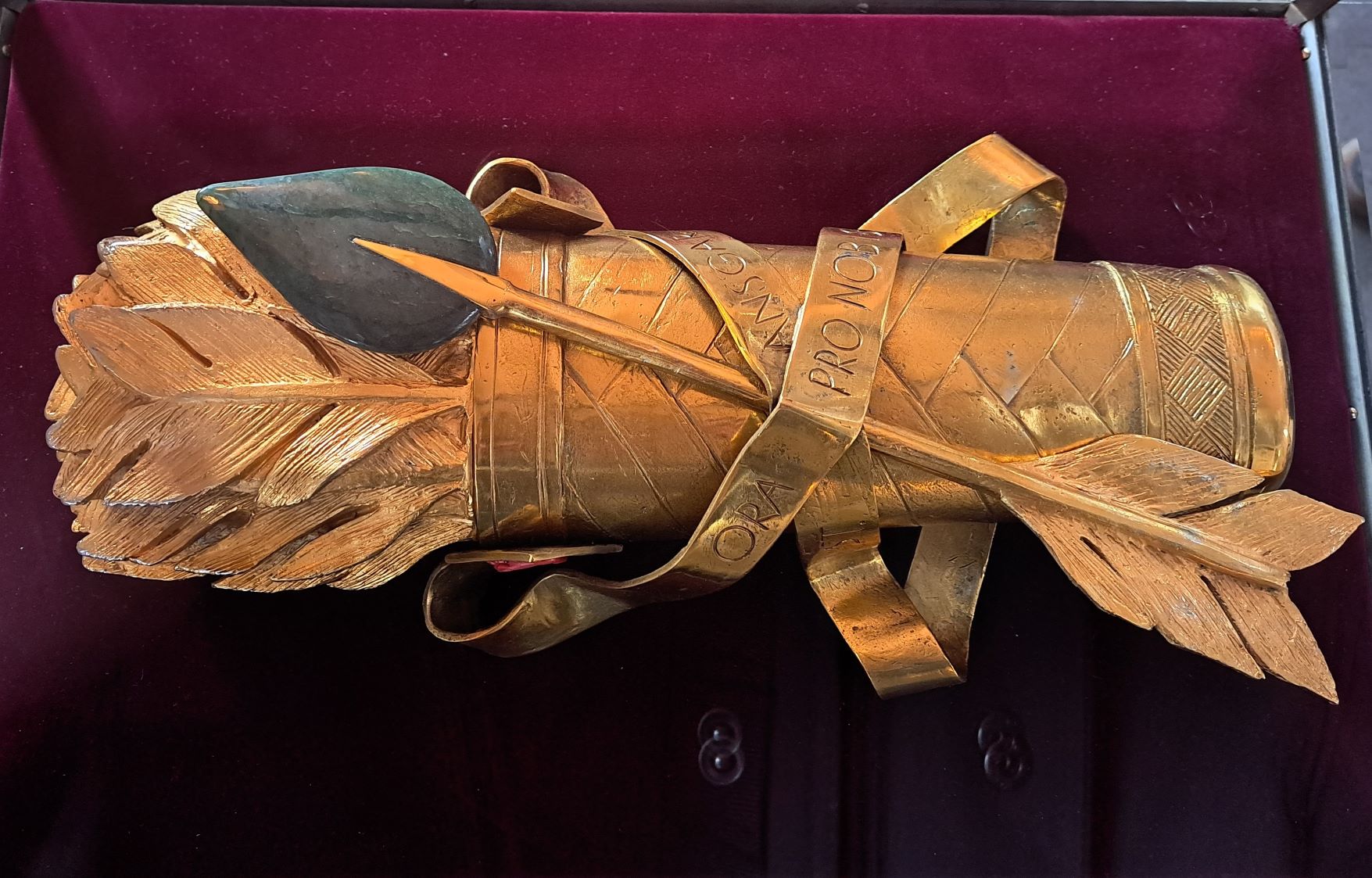Köcher mit Speer und Gravur: ora pro nobis - bitte für uns