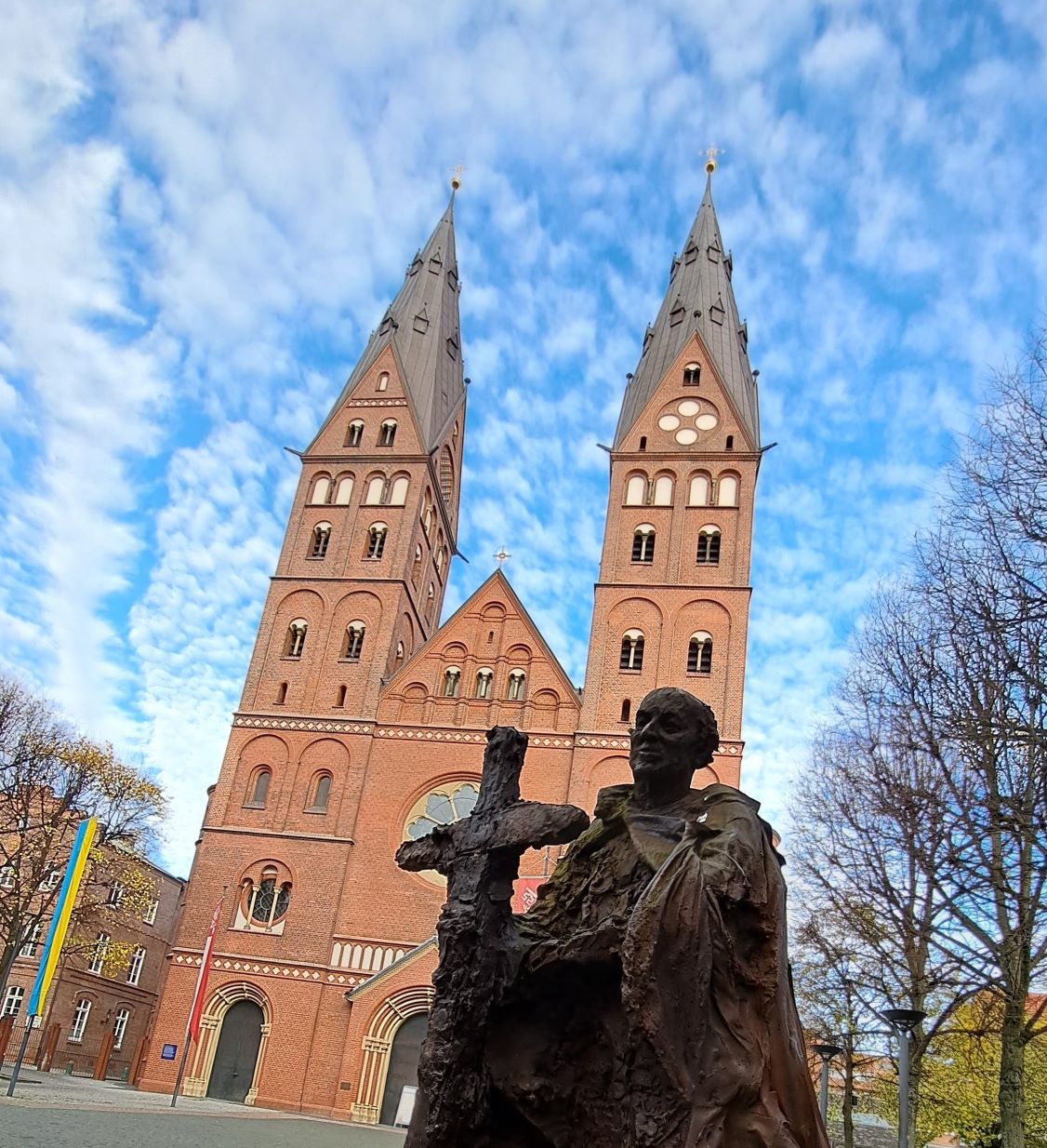 Turmfront der Kathedrale St. Mariendom Hamburg mit moderner Ansgar-Skulptur im Habit und Kreuz