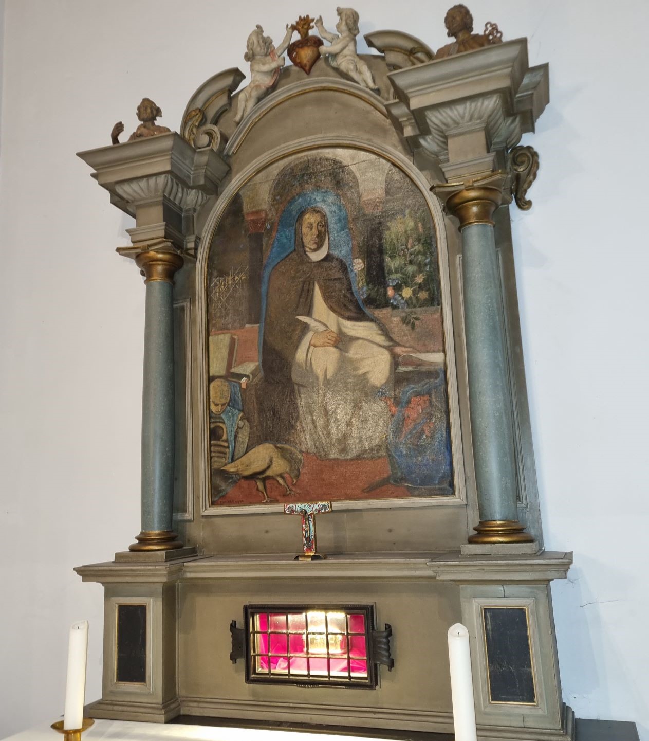 Heiliger Albertus mit Schreibfeder, darunter Reliquiar in der Kirche St. Albertus Magnus in Köln-Lindenberg
